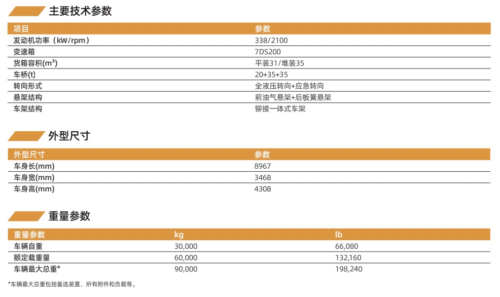載重:60t 發(fā)動機功率:338kw,460PS@2100rpm 車廂容積:35m3