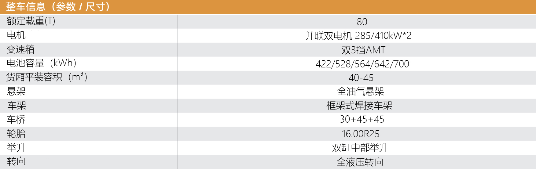 額定載重:80T 電機雙電機:額定570kw峰值820kw 貨廂平裝容積40-45m3